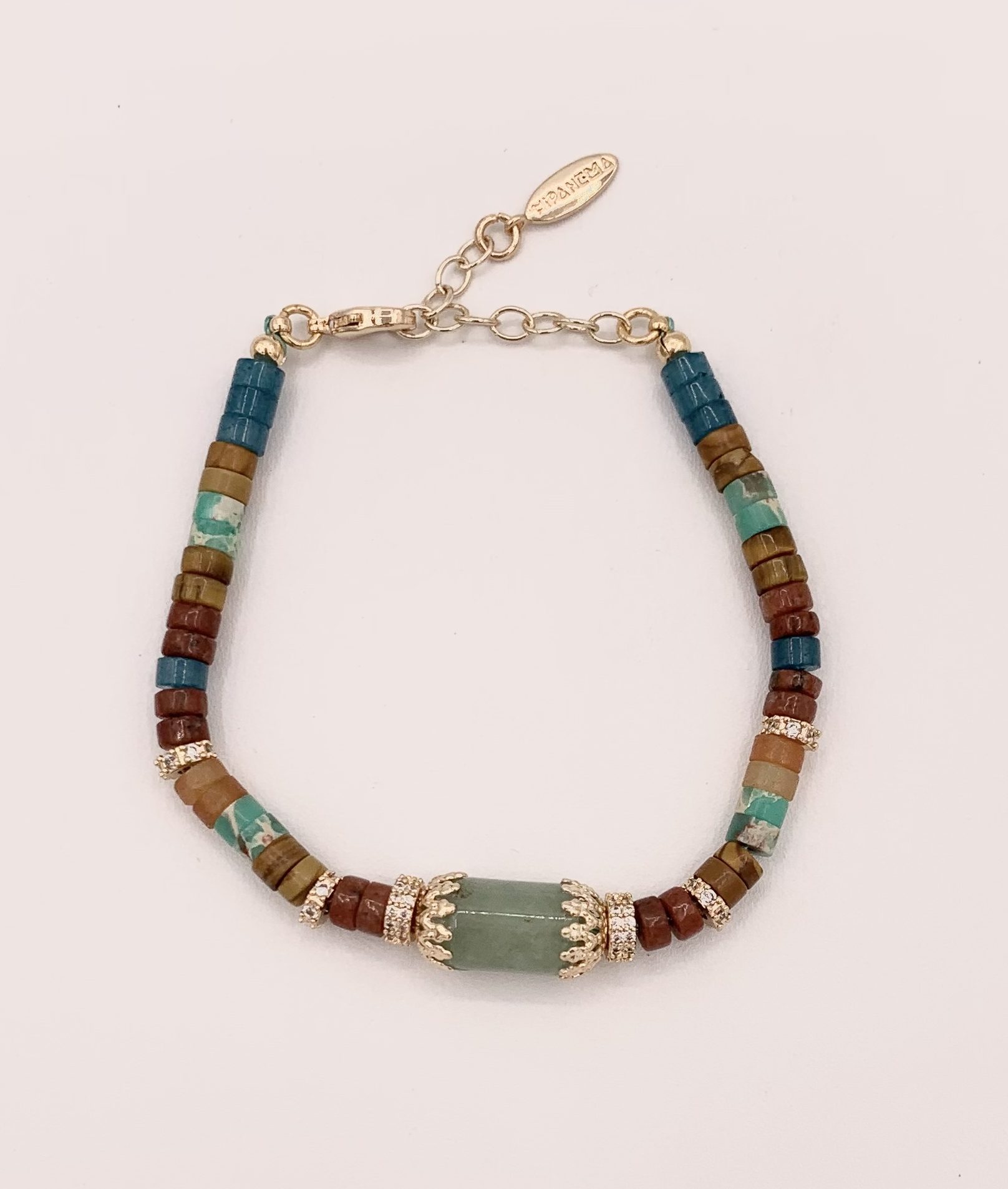 Ce bracelet est composé de perles plates en pierres semi précieuses et embelli de petits strass.