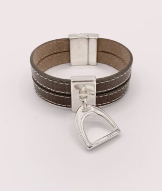 Ce bracelet double cuir marron foncé est orné d’un étrier en plaqué argent.