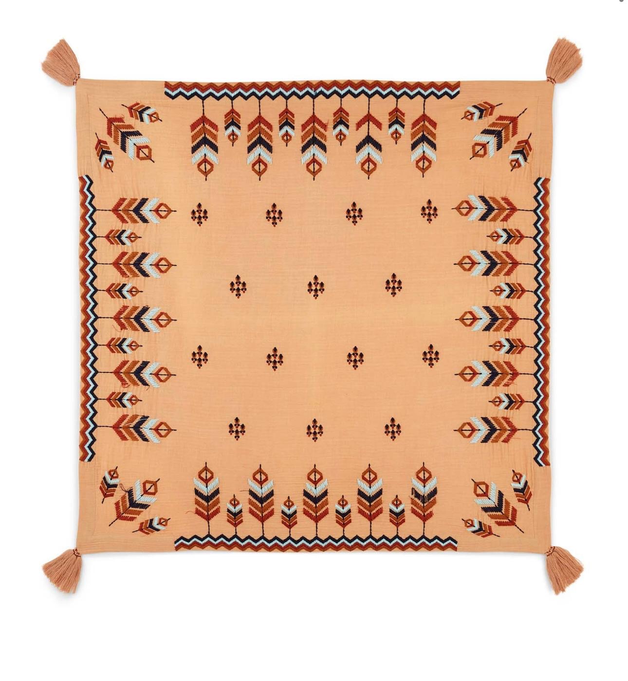 Ce modèle en gaze de coton dans les tons pèche et caramel, paré de pompons.