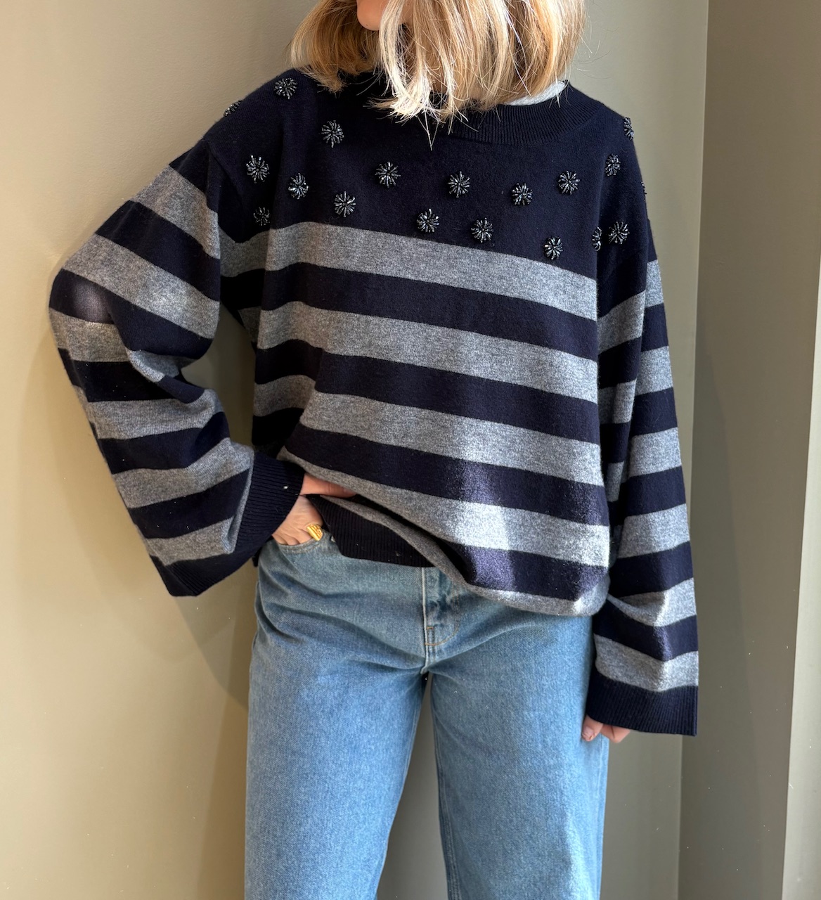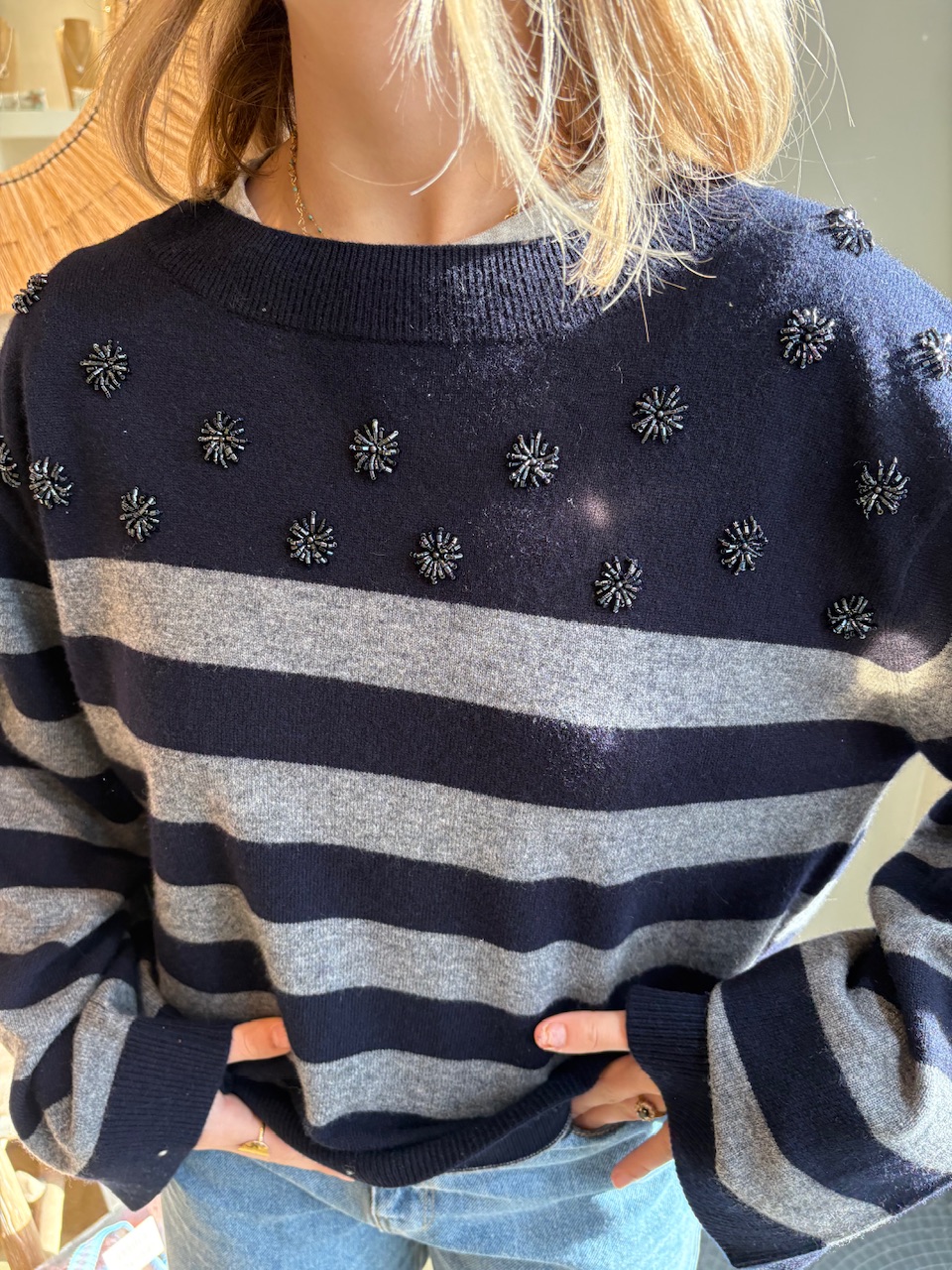 Ce pull en maille a une coupe ample et un col bateau.