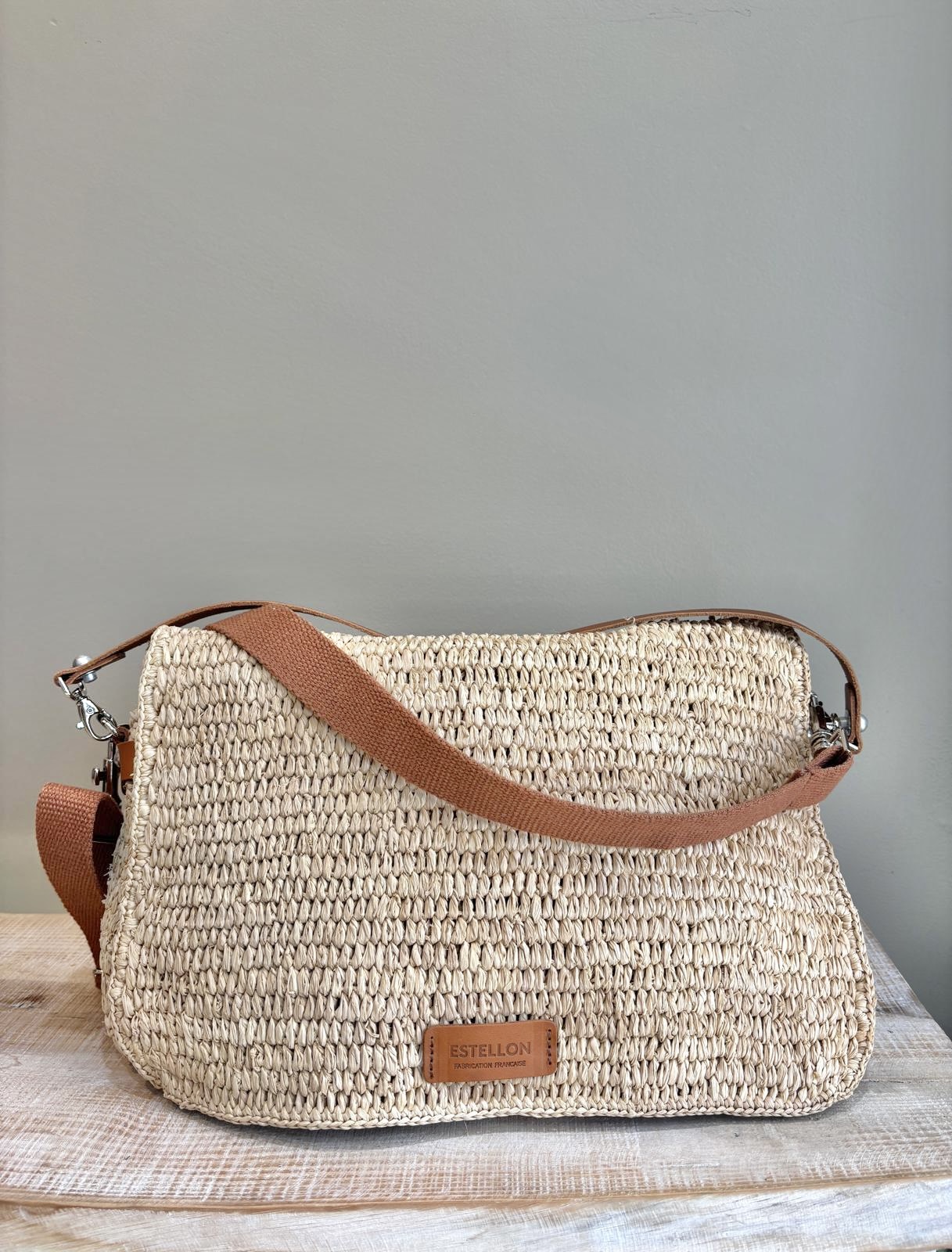 Sac en raphia avec hanse, porté épaule, et bandoulière. Couleur Naturel.