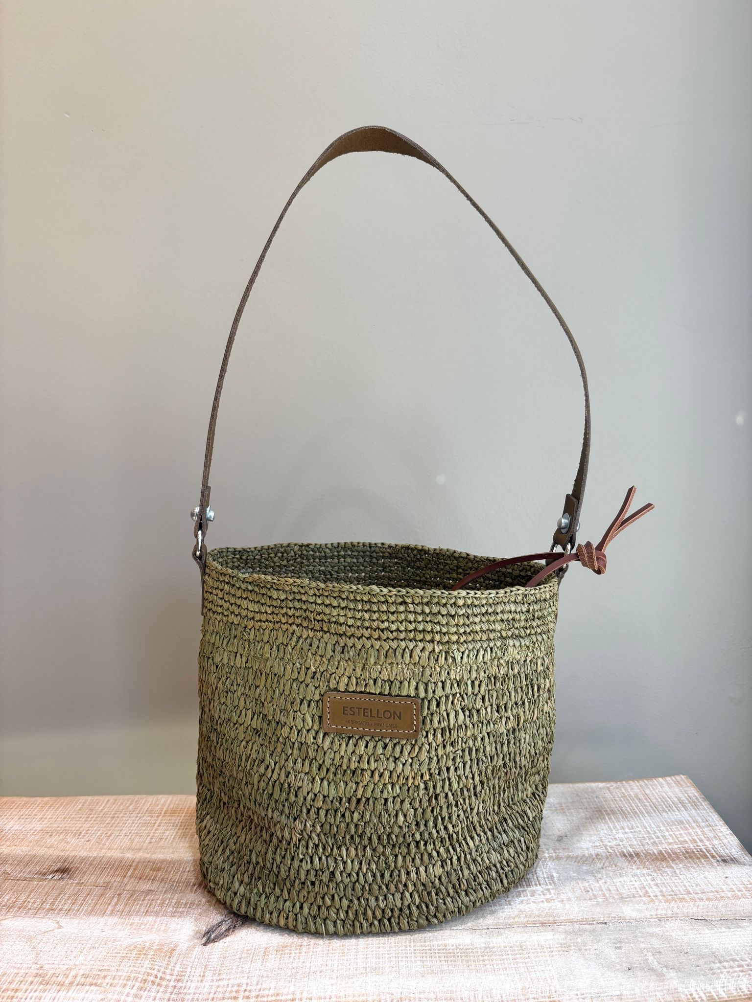Sac en raphia avec hanse, porté épaule, couleur kaki.